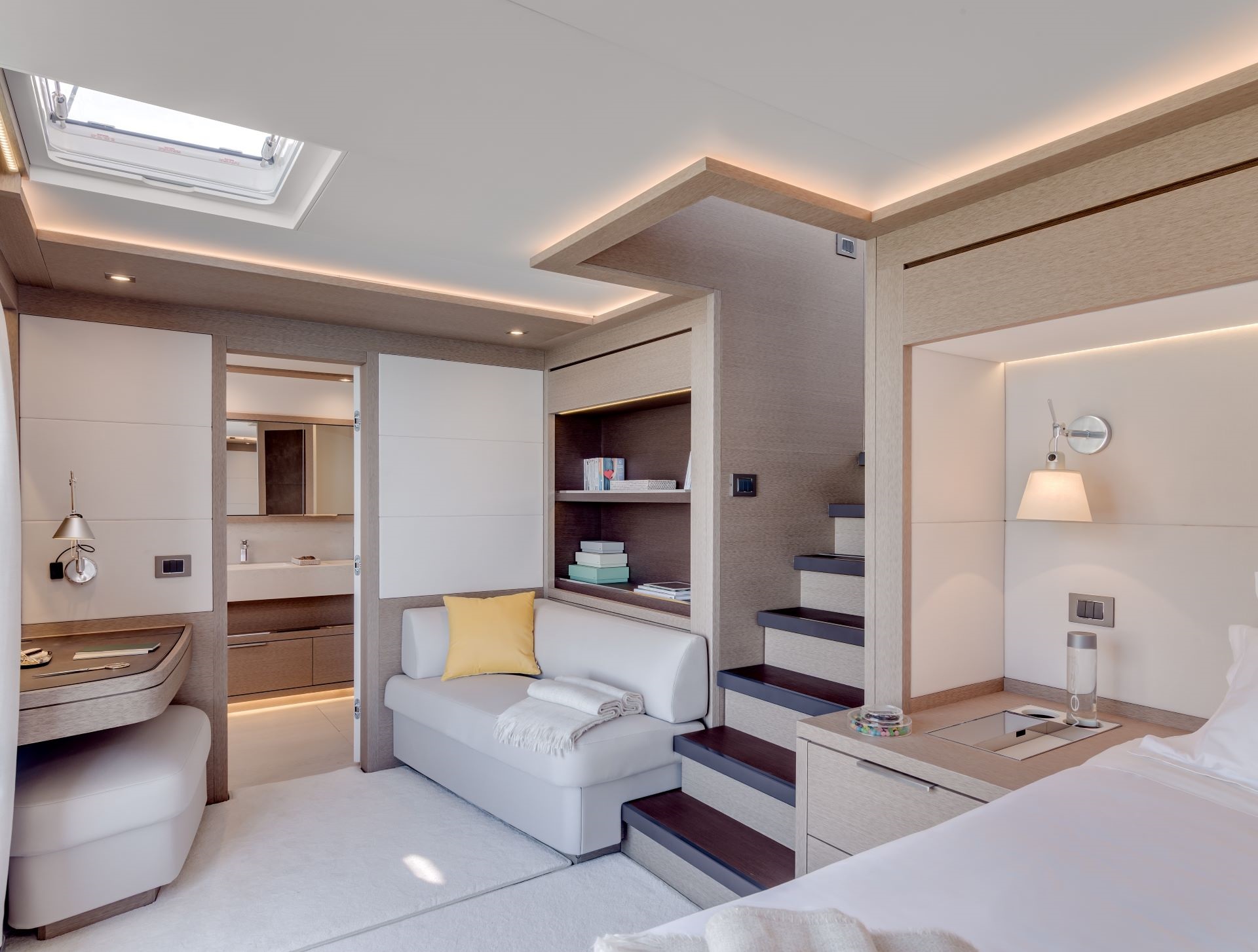 Privilège suprême, la mer s’offre en privée dans la suite propriétaire grâce à sa plage parfaitement intégrée dans le bordé. La connexion aux éléments, plus que tout.