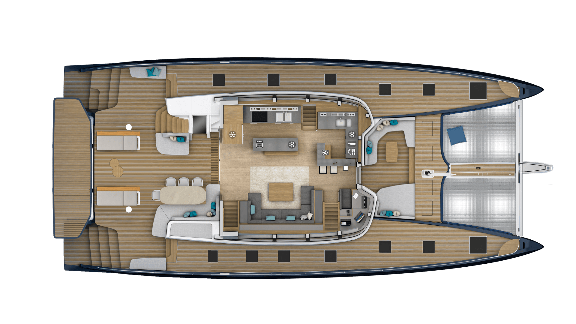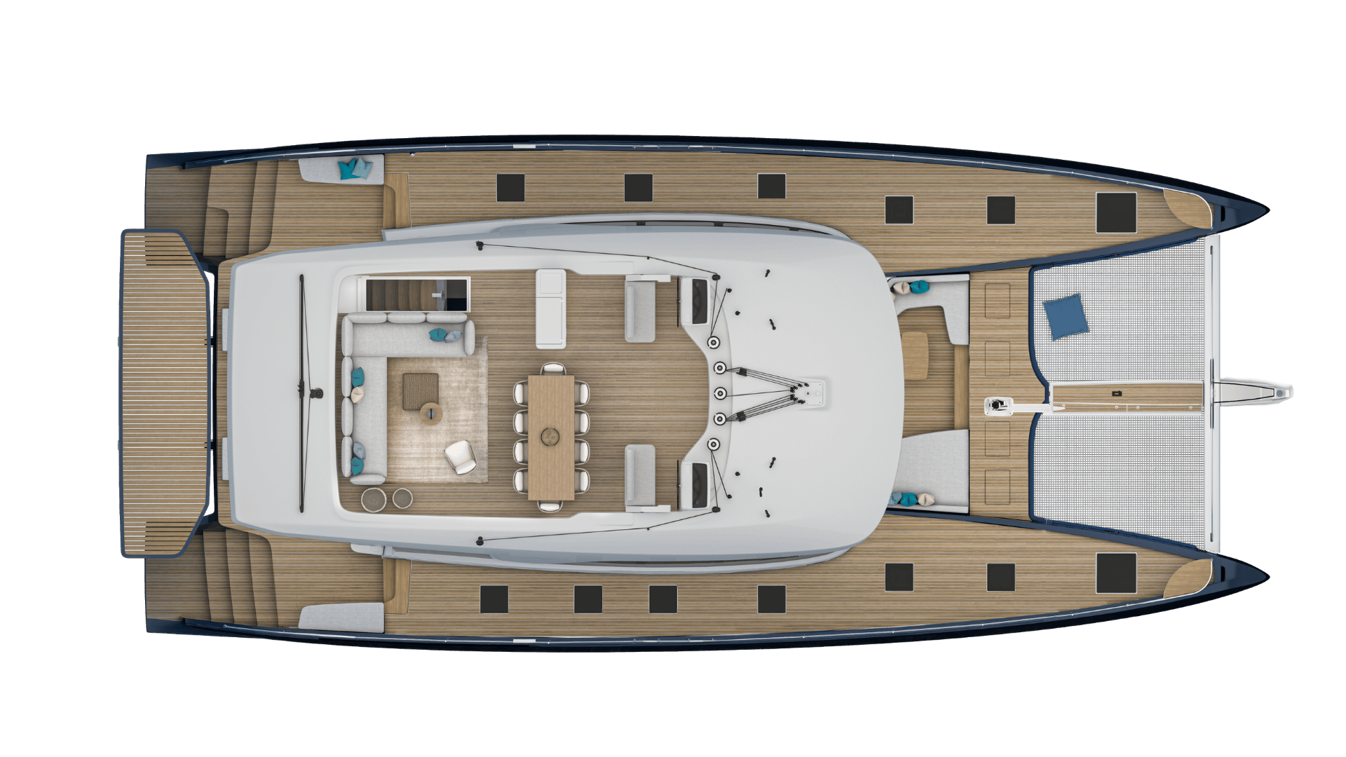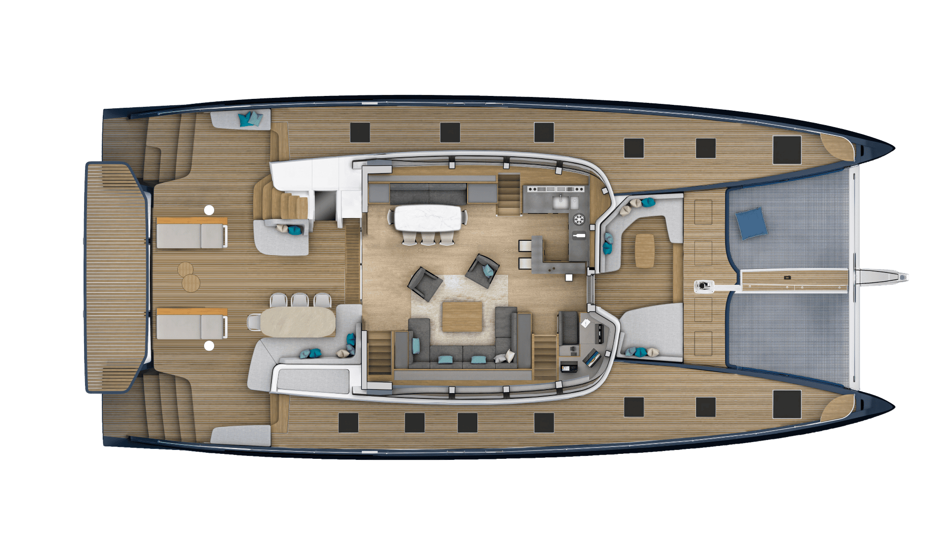 Equipado com um posto de pilotagem duplo e painéis solares, o flybridge é também um lugar de expressão pessoal: pode ser organizado de acordo com os seus desejos para criar um espaço adaptado a si.