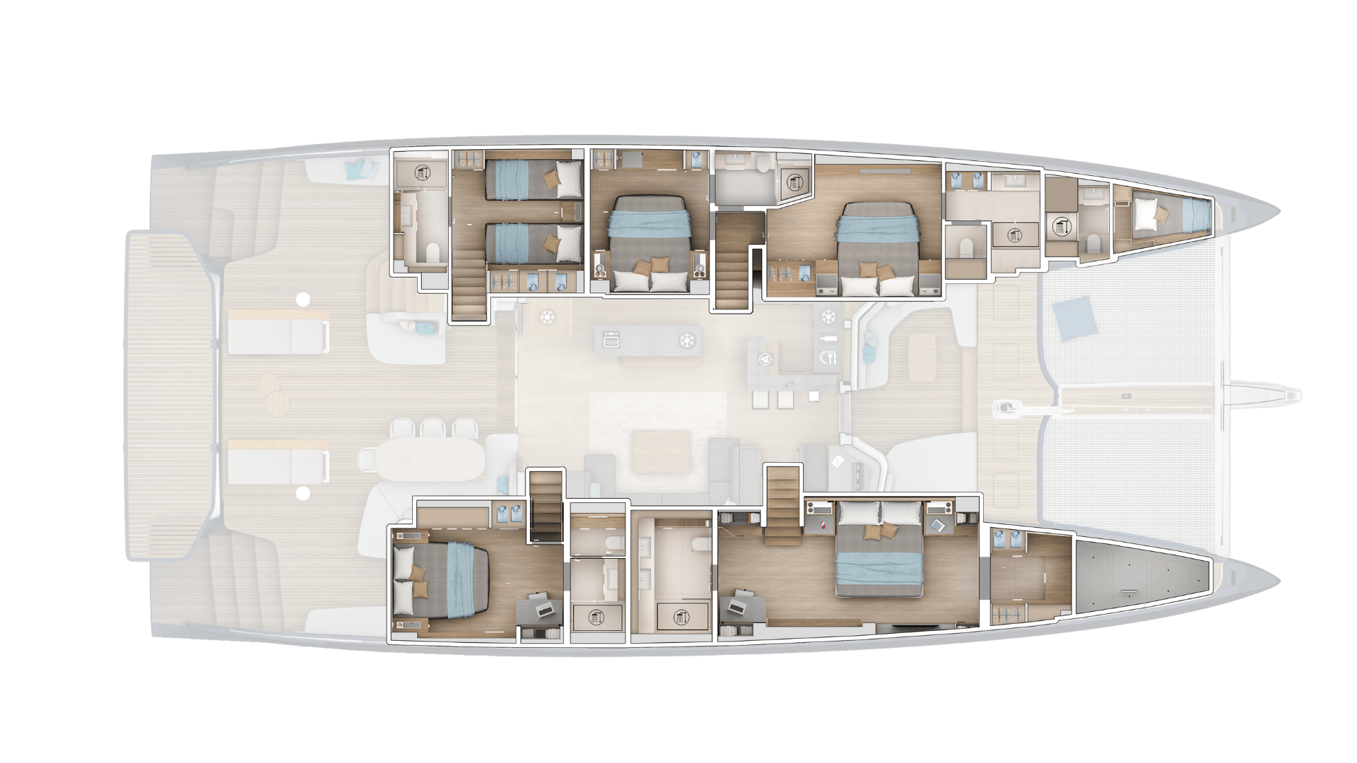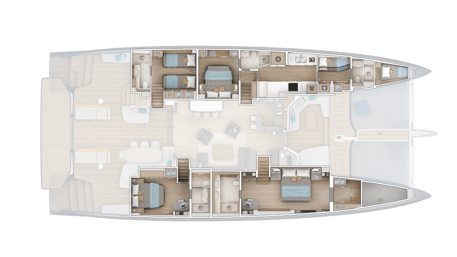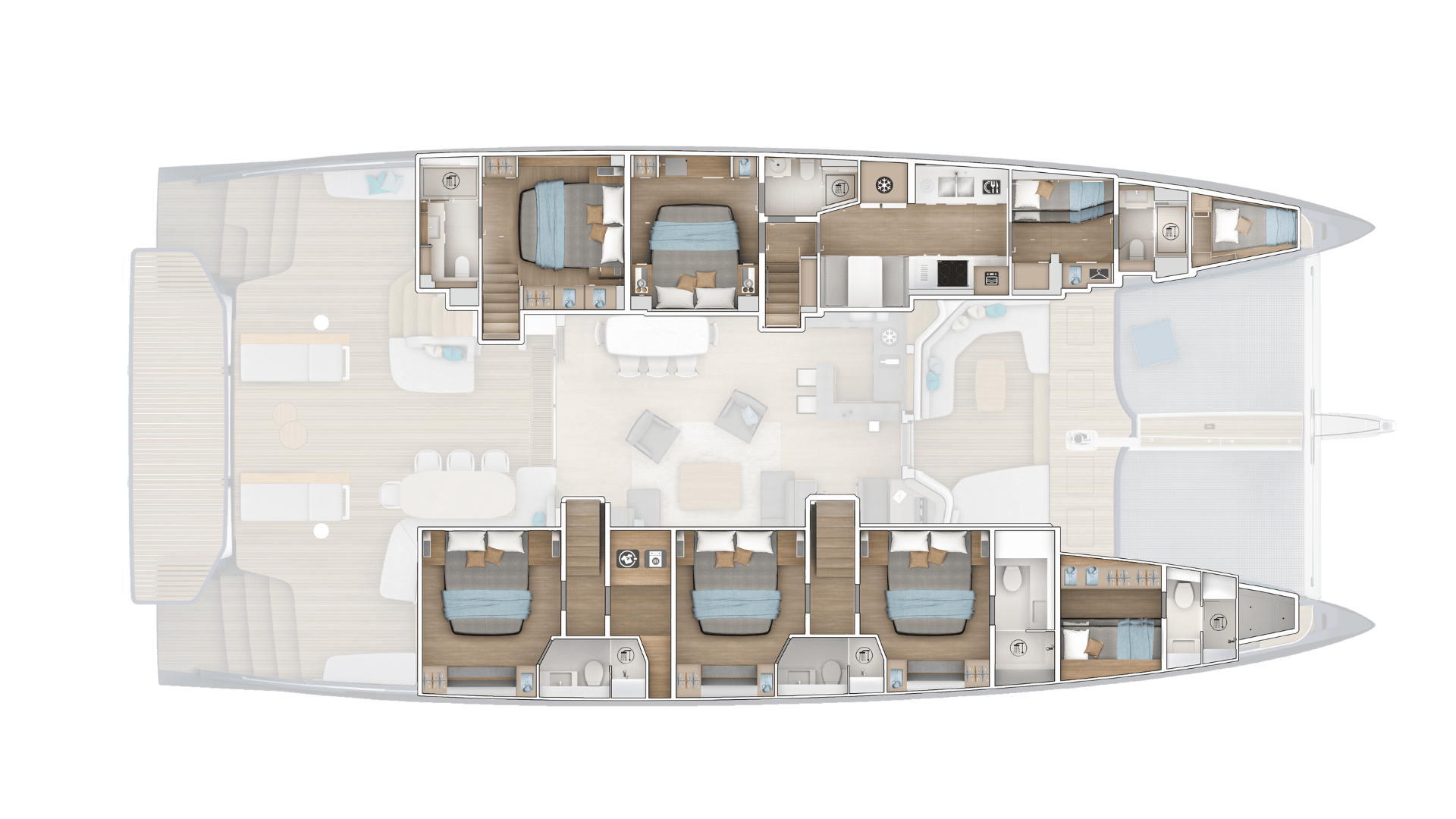 Equipado com um posto de pilotagem duplo e painéis solares, o flybridge é também um lugar de expressão pessoal: pode ser organizado de acordo com os seus desejos para criar um espaço adaptado a si.